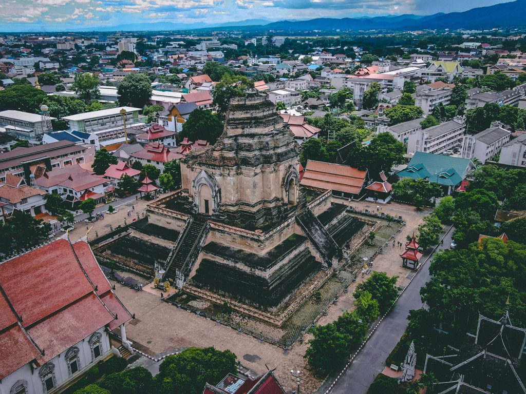 A drone shot of Wat Chedi Luang, a temple in Chiang Mai